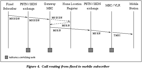 is routed through the fixed land network to a gateway MSC for the GSM network